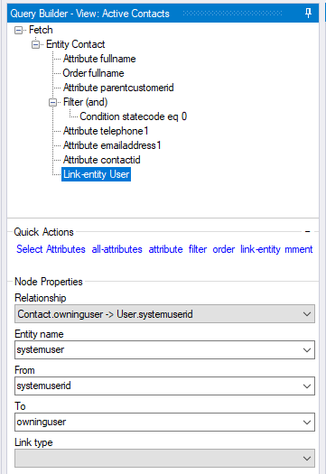 First I opened system view Active Contacts in FetchXML Builder.