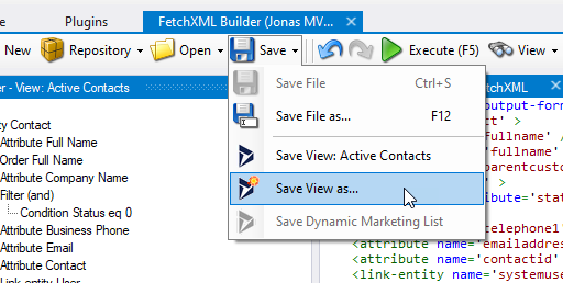 To try the view in my Dynamics 365 organization, I save the view as a new personal view (I don’t want to overwrite the system view Active Contacts at this point).