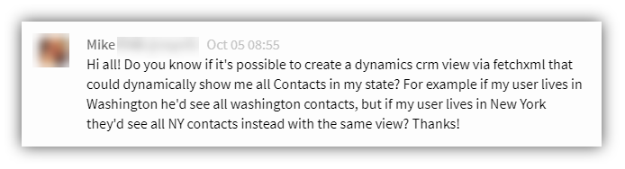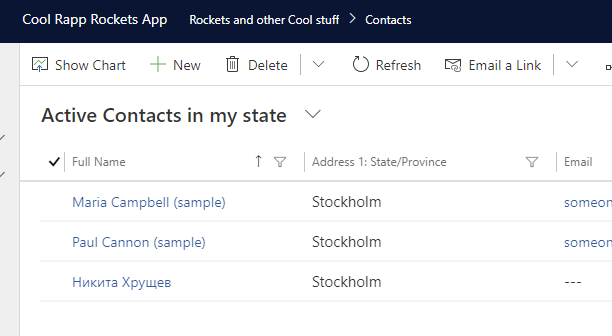 This query has no magic, and will only show contacts where current user is the owner of the contact record. But our task was not to use the owner lookup, but to show contacts with an address in the same state as the current user’s state.