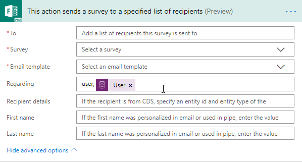 One thing that we recently ran into with the new Flow activitiy that can generate personalized sendouts, was how to format the syntax of the regarding field. The reason for the confusion is that it is different than how the Common Data Service (CDS) connector handles the Regarding field, which is with two fields, one for the object id and one for the type. In Forms Pro, it is all in one field in the syntax