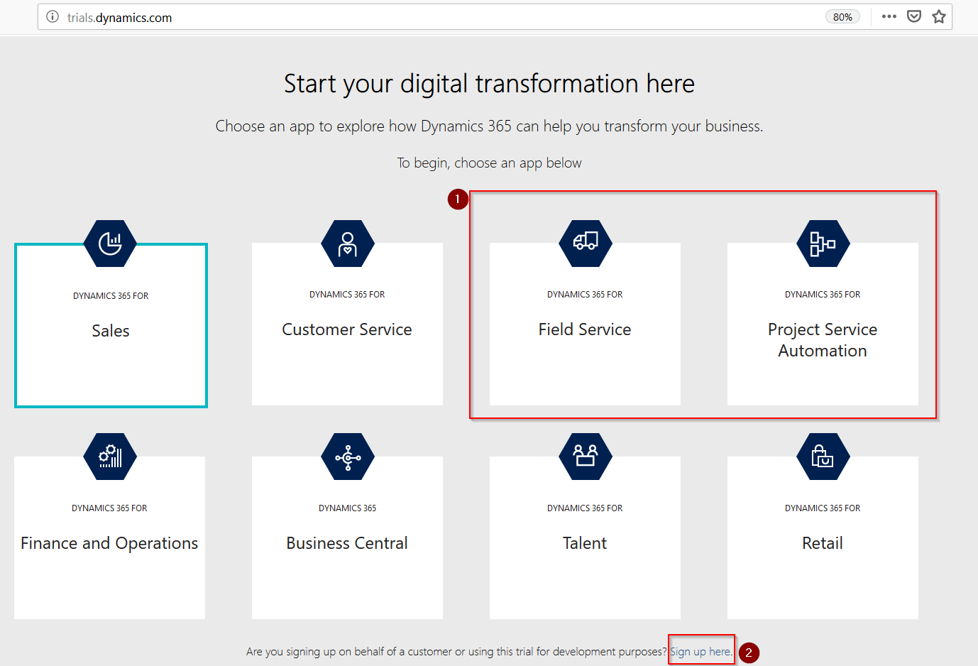 The easiest way is to navigate to trials.dynamics.com and choose either Field Service or Project Service Automation (1) and then use the sign up here link (2).