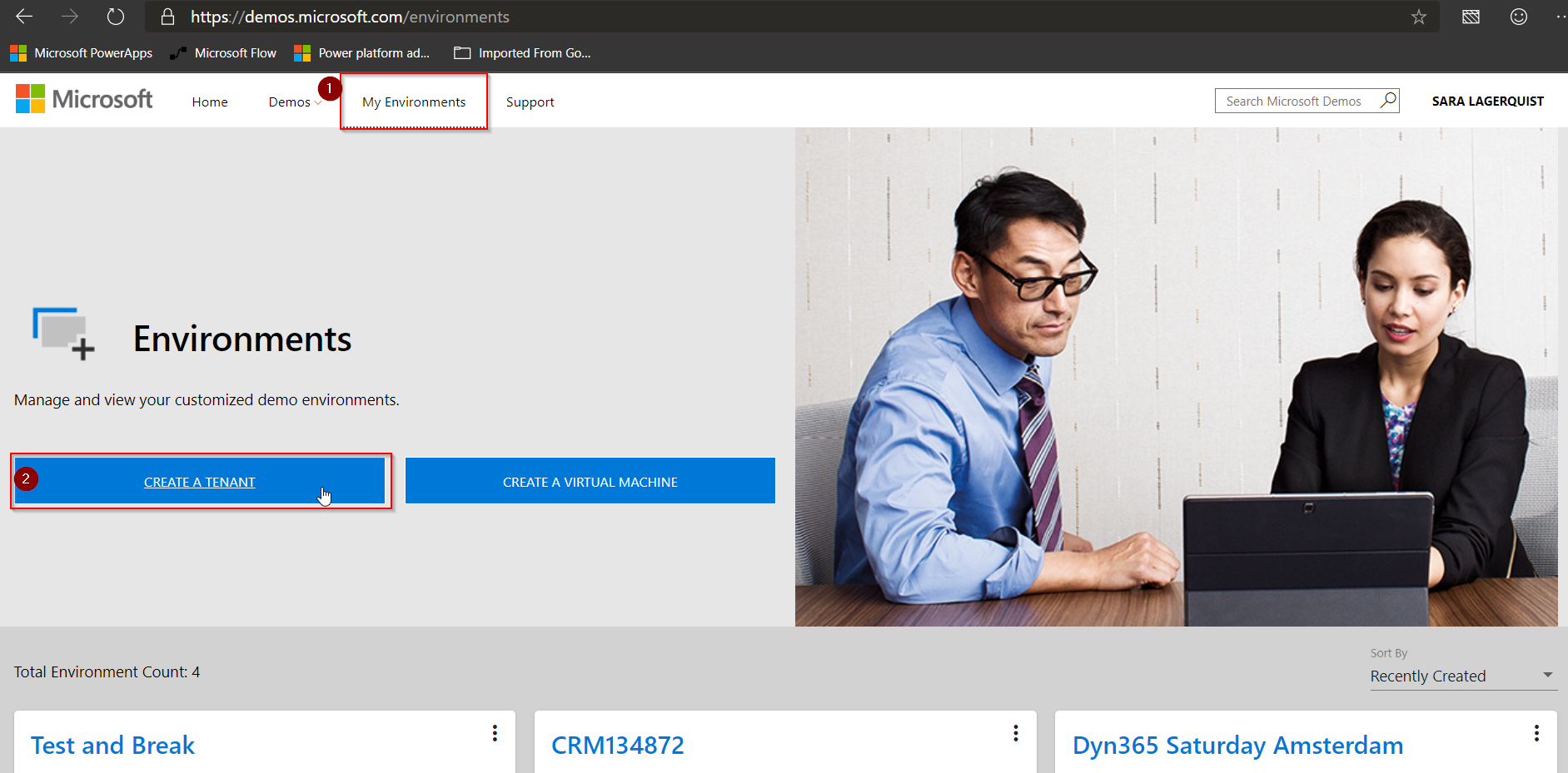 After logging in with your work account choose My Environments (1) and click on Create a Tenant (2).