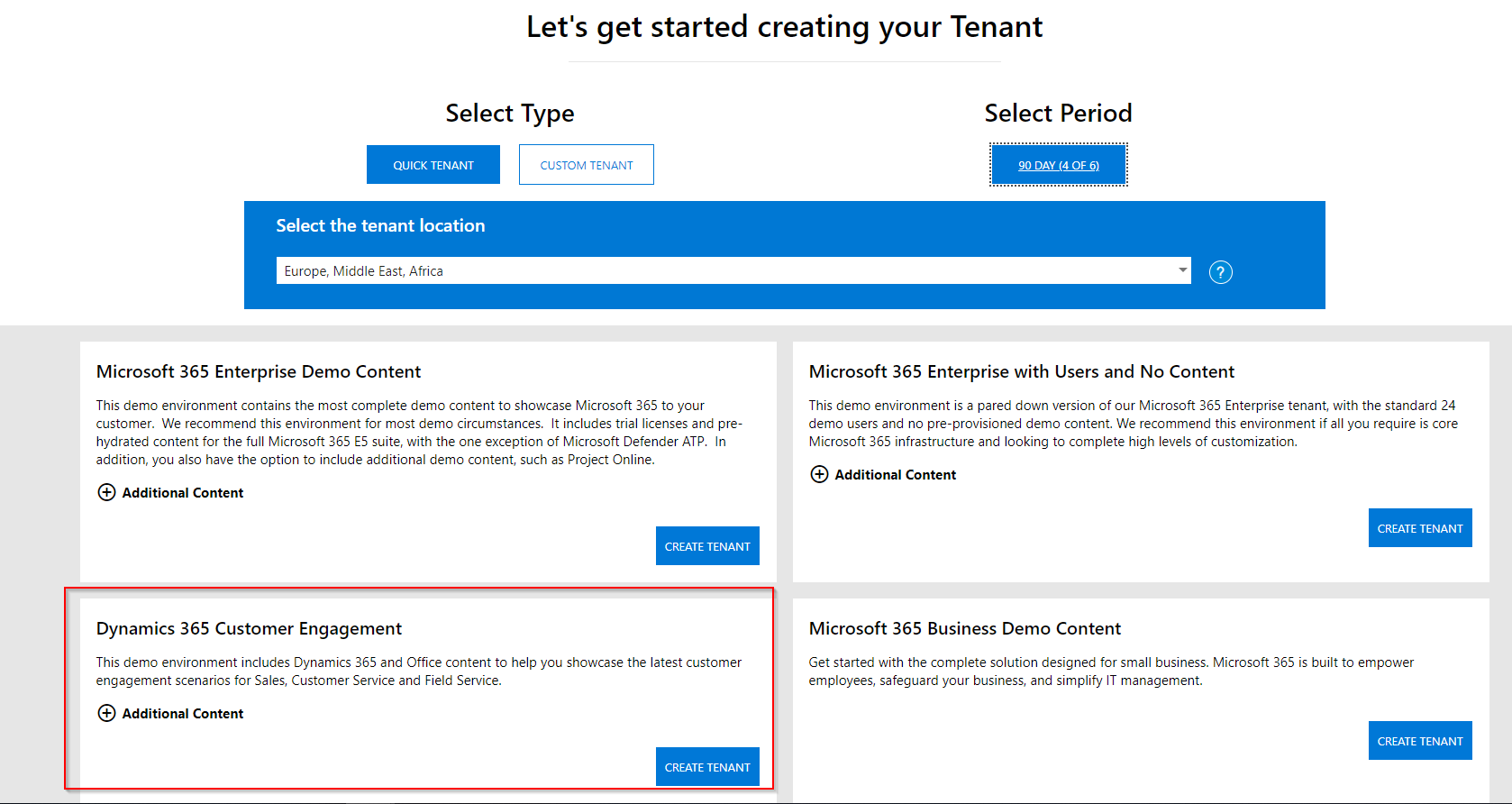 In the next step you choose your location (this might be useful to change if you want to enter an Insider Program with preview features only released in other locations than your own) and that you want a Customer Engagement environment.