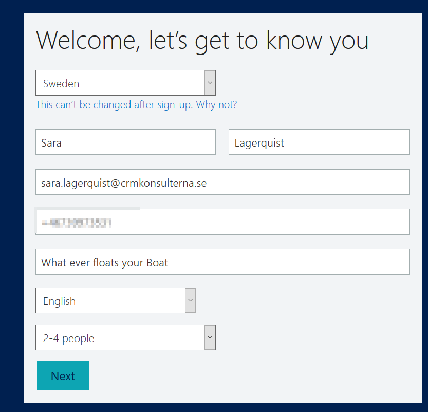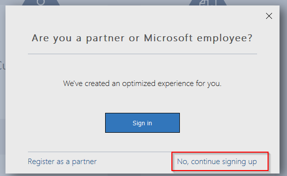 And here is the step I’ve seen many fellow partner consultants struggling with. Do Not Sign In. Neither should you register as a partner. Choose No, continue signing up – and you will avoid running into issues like all of your partner instances been taken by colleagues.