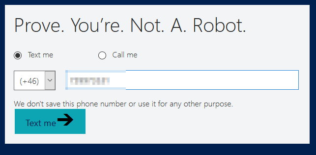 Next up is to prove you’re not a Robot. Should be fairly easy if you’re human and have a phone. Enter your phone number, get the text with the verifcation code and enter the code.