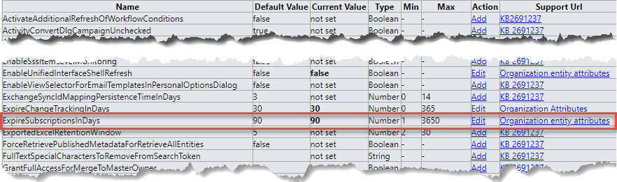 After a few emails back and forth, the excellent support technician at Microsoft informed me that there is actually a setting in the infamous super secret setting tool with the Star Trek-sounding name OrgDBOrg (it is pronounced “Org-D-Borg” in case you ever get stuck in Dynamics trivia). The setting is called ExpireSubscriptionsInDays. I will quote the support technician in what this table is used for and if anyone has any more information, please leave a comment.