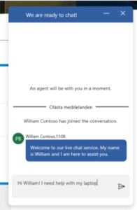 Agenten får sedan en inkommande chattförfrågan som ett pop-up fönster. Chatten tilldelas agenter beroende av belastning. Detta minimerar väntetiden samt säkrar att kunden snabbt får hjälp.