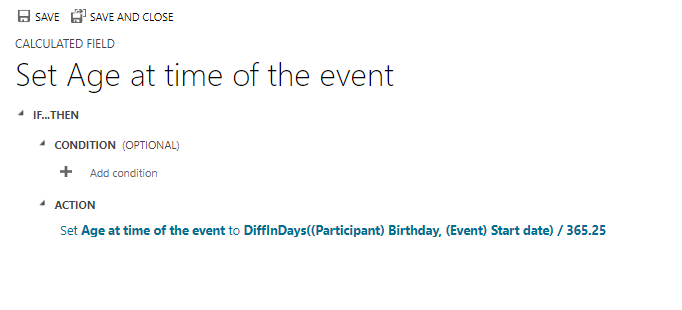 If I were to use Birthday on contact in a calculated field and either use the DiffinYears or DiffinMonths, it would not be precise enough. The reqirement is not that the participant should be of the right age that year or that month. It has to take the exact day into consideration. Okay – but what about DiffinDays? Which lead me in to challenge number three.