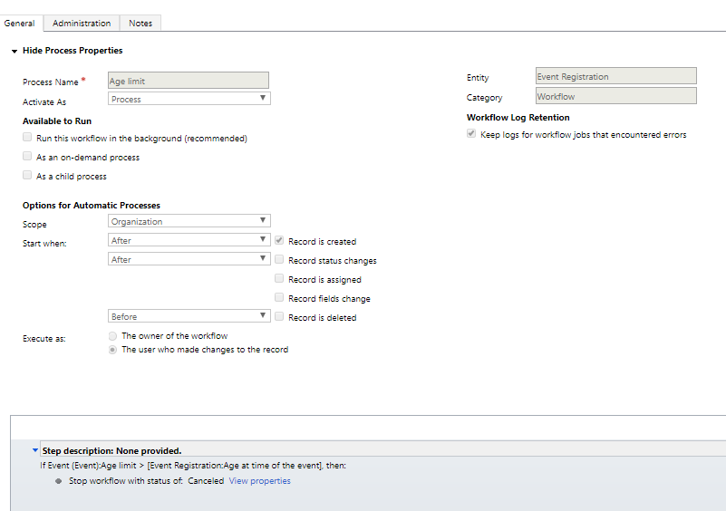 I will then create a real-time workflow that runs on Create of the Event Registration, compare the Age limit at the Event entity with the calculated field.