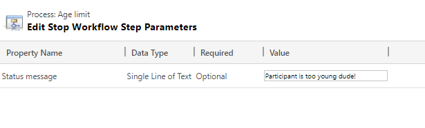 If the age limit is greater than the age at the time of the event I’ll cancel the workflow with a message telling the user that the participant is too young to be registered.